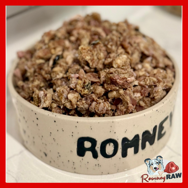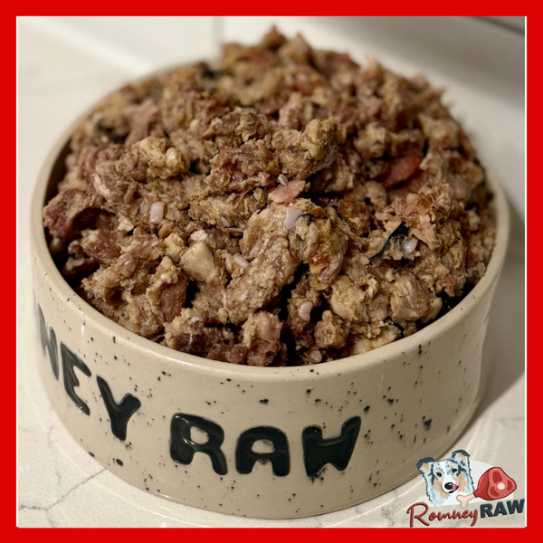 British Beef Trim (45%), White Fish (15%), Salmon (10%), Beef Heart (10%), Lamb Bone (10%), Lamb Lung (5%), Lamb Liver (5%).
