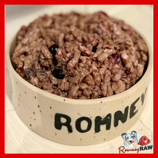 5% Chicken/Turkey/Duck (containing approx. 10% bone) 10% Offal, 15% Sweet Potato/Blueberries